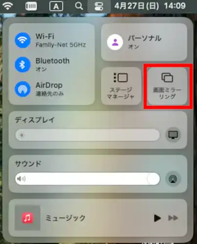 コントロールセンターの右上の方にある【画面をミラーリング】をクリックします。
